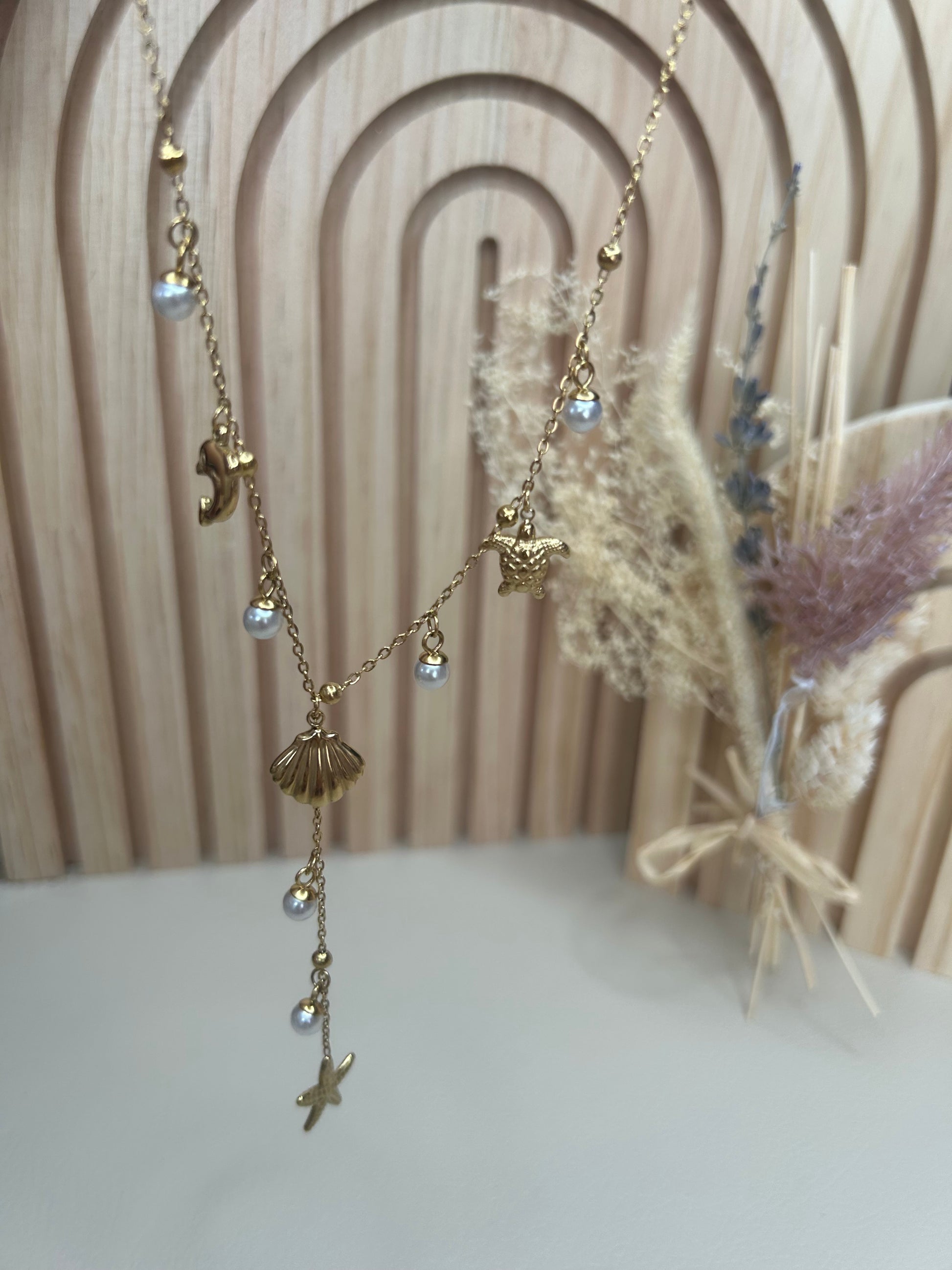 Ce collier en Y, réalisé en acier inoxydable capture l’esprit de l’océan avec ses breloques détaillées représentant un dauphin, une tortue, étoile de mer avec des petites perles blanches. Chaque élément est soigneusement travaillé pour refléter la beauté et la sérénité du bord de mer. Résistant, élégant et intemporel, il apporte une touche marine raffinée à toutes vos tenues.