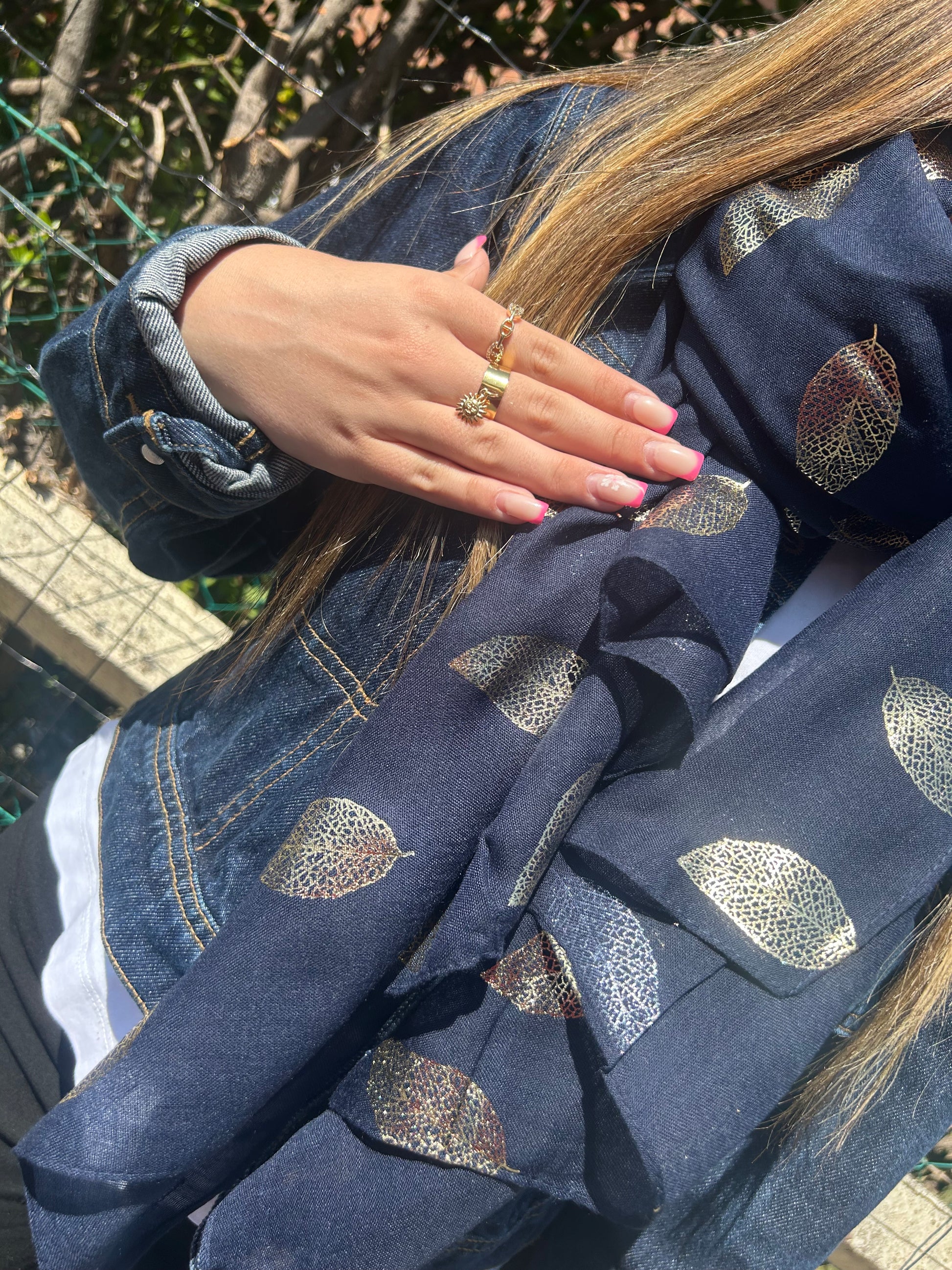 Plongez dans l’élégance avec ce foulard bleu marine sublimé par de délicates feuilles dorées. L’association du bleu profond et des reflets lumineux crée un contraste sophistiqué qui attire le regard.